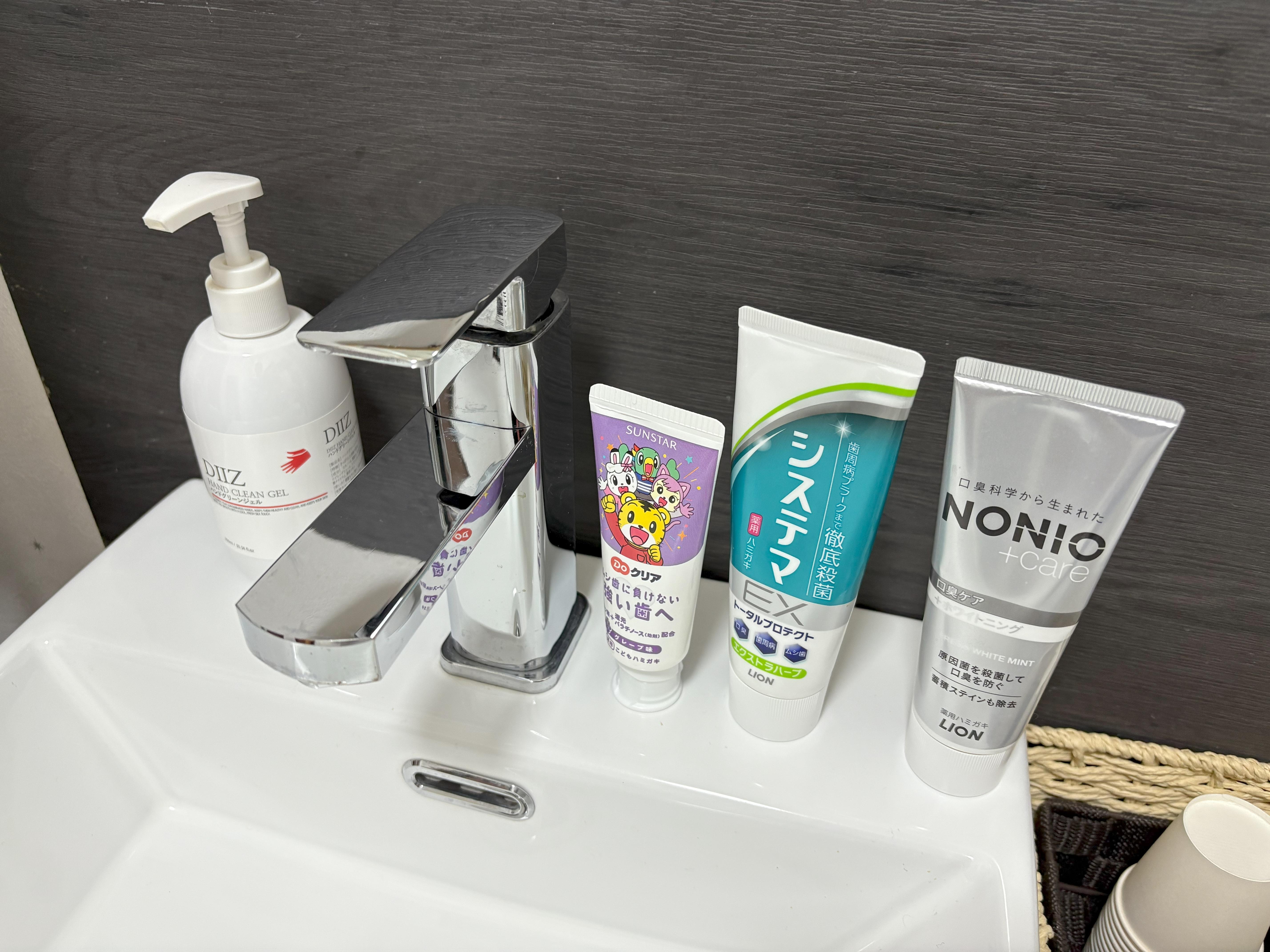 友人や家族と一緒だと洗顔や歯磨き時間が重なってしまう事が多いですよね。化粧水や乳液などの女性にも喜ばれる物を常備しました。